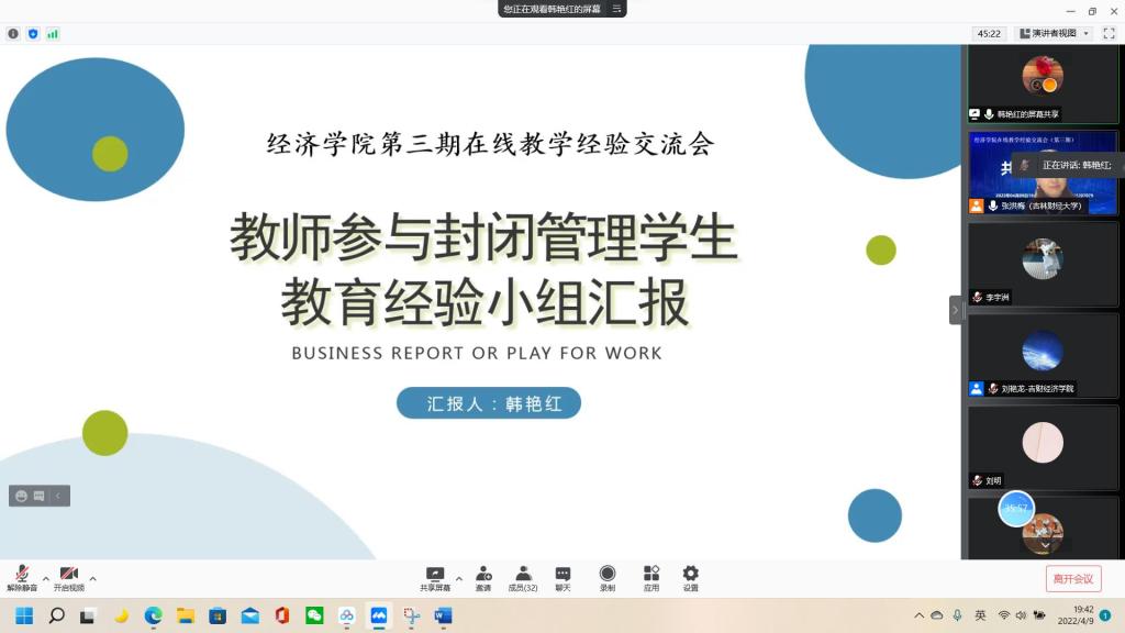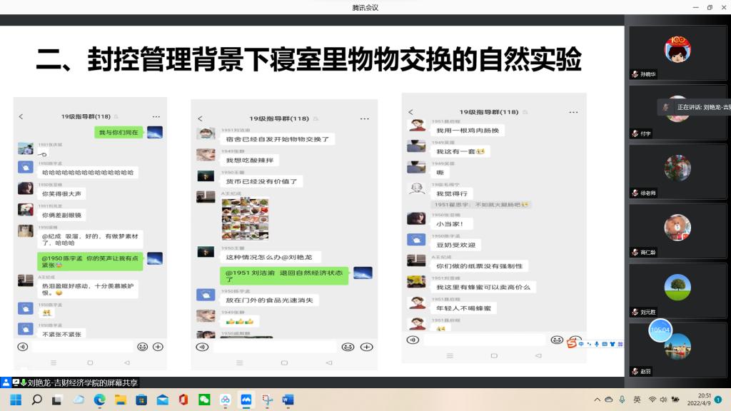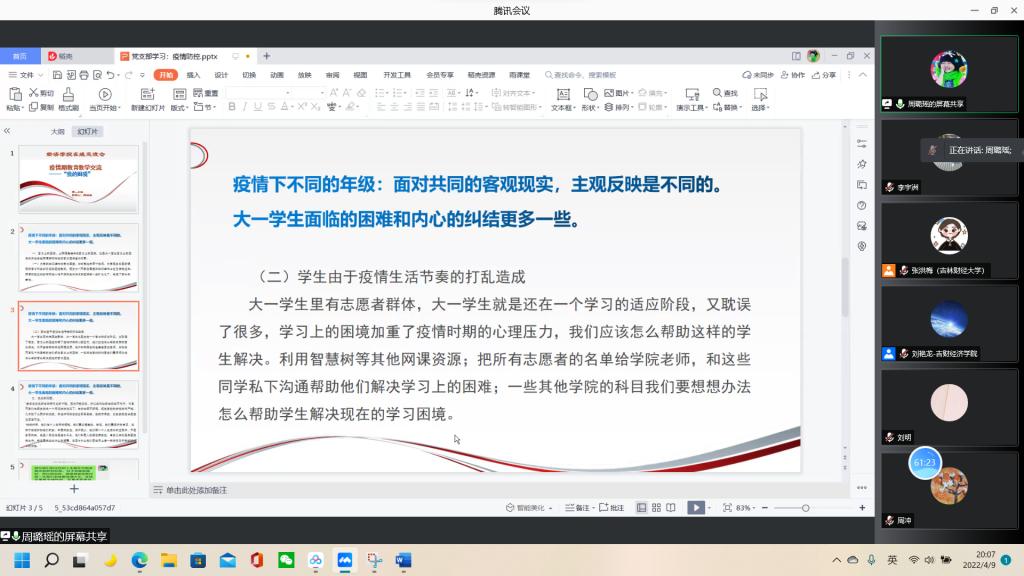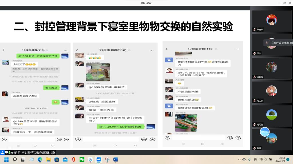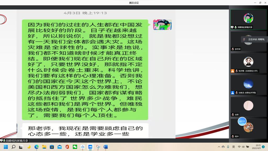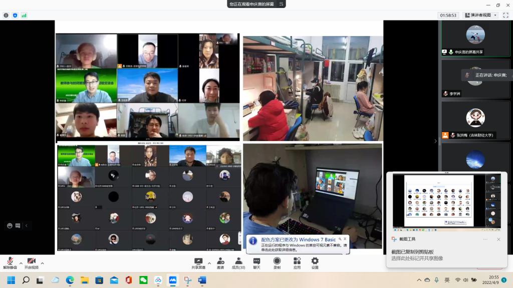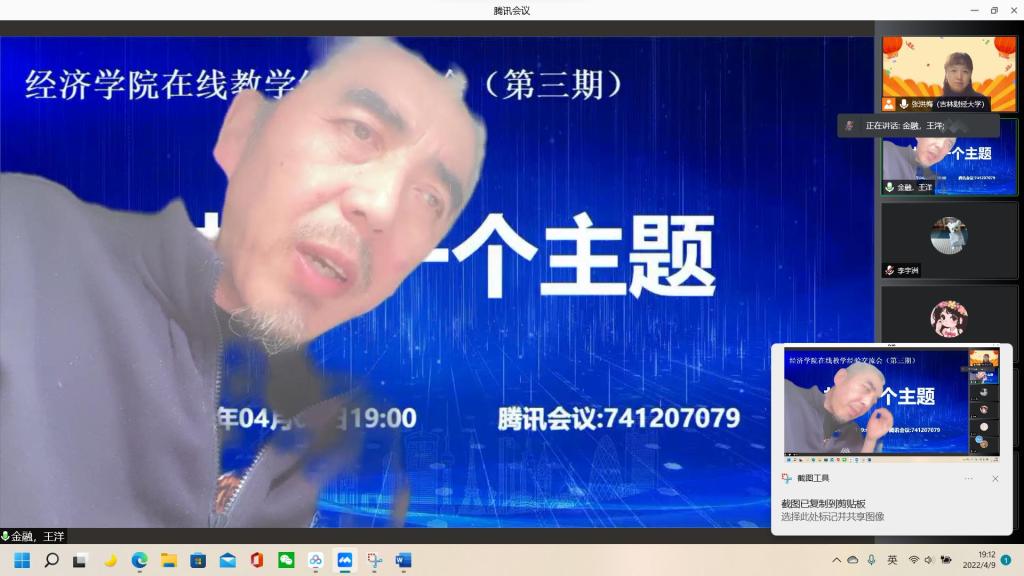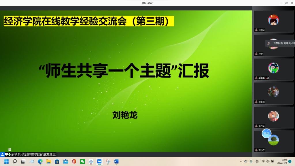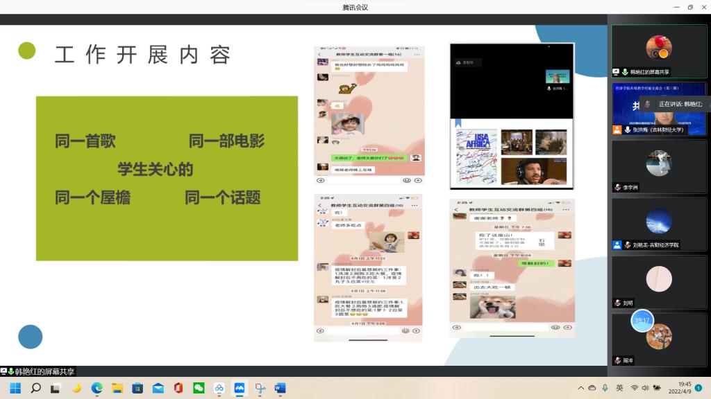 4月9日19:00,永利yl23411通过腾讯会议举行了“抗疫你我 课堂内外”系列活动第五期暨“共享一个主题”专题交流会。“共享一个主题”活动的开展,旨在全面做好疫情防控期间的教学工作。通过“同看一部电影、同读一本书、同唱一首歌、同聊一个话题、同讲一个故事、同练一段舞蹈”加强教师与员工之间的沟通交流,切实拉近疫情防控静态管理期间师生间的距离,有效调节员工心理状态和自控水平。