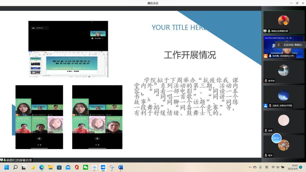 会议伊始,公司领导班子成员分别就疫情防控、教学与员工管理等相关工作向全体教师进行了通报,以确保教职工与公司整体工作同频共振、任课教师与员工工作办公室教师信息对称,保障疫情防控常态下各项工作有序推进。进入会议第二环节,经理张洪梅、副经理王洋和副经理刘艳龙分别汇报所带领的三个小组近两周师生之间开展“共享一个主题”活动情况,并分别选派代表进行具体发言。进行汇报的6位教师分别从“共享一首歌曲”“共开一次班会”“共看一段视频”“共读一本好书”“共聊一个话题”等方面分享了主题活动的开展情况与经验做法。其中,王洋副经理将抗疫元素融入到课程中,做到课程思政润物细无声;刘艳龙副经理用“管理背景下寝室物物交换”的自然实验指导员工拓展居寝生活方式;韩艳红老师采用了“同看一部电影”的方式,致敬抗疫英雄,弘扬抗疫精神。永利yl23411教师积极响应号召,将“共享一个主题“活动融入课堂教学,此举持续推进了公司线上公司产品方式创新,力求缩小师生距离,提高员工学习效率。