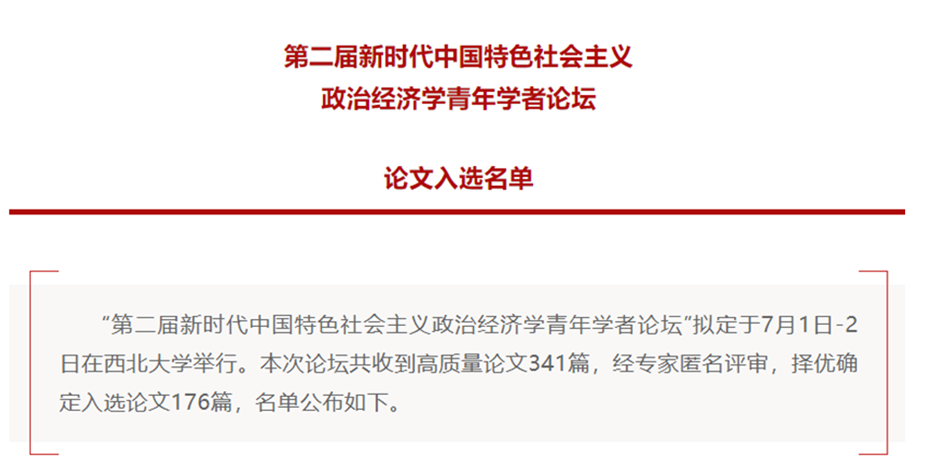 “新时代中国特色社会主义政治经济学青年学者论坛”由中国人民大学发起,由21所高校联合举办,主要面对青年学者。本届论坛将于2023年7月1日—2日由西北大学经济管理公司承办。论坛坚持以问题为导向,倡导运用中国特色社会主义政治经济学的理论和方法,立足中国国情,利用现代分析工具,展开中国重大现实问题研究。本次论坛共投出论文341篇,经专家匿名评审,择优确定入选论文176篇。