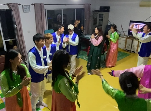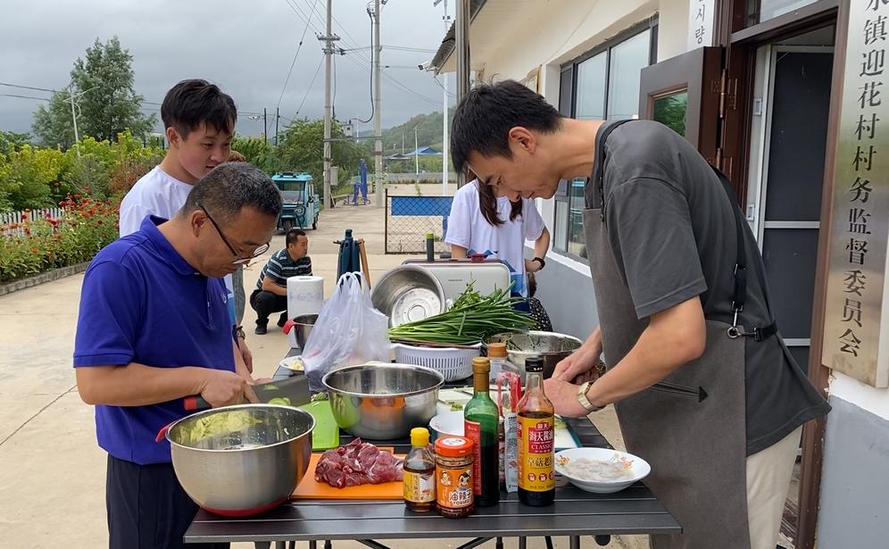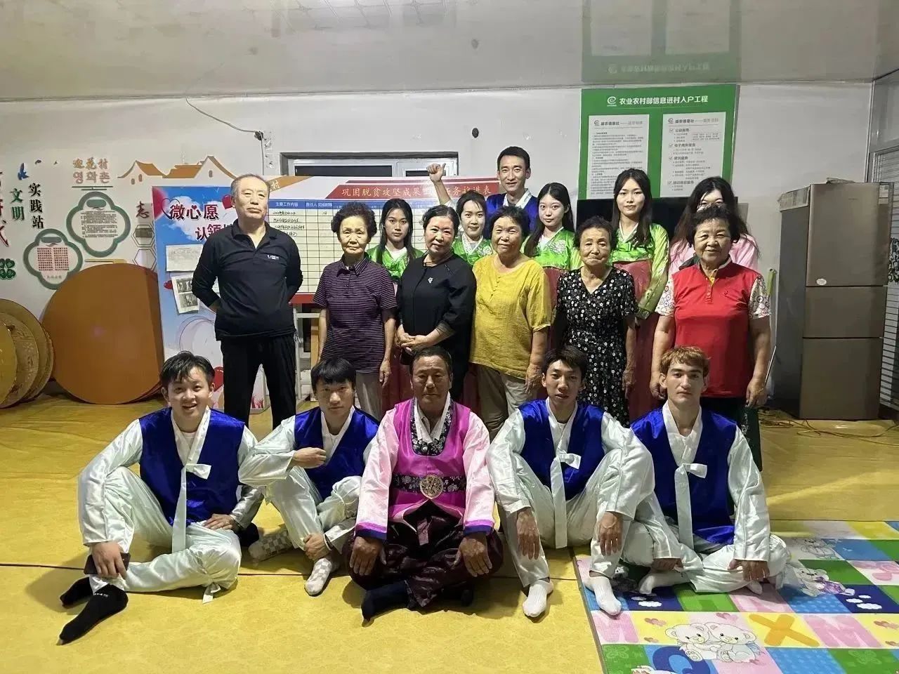 4、关爱迎花村老年人群体、体验朝鲜族风土人情,组织实践团队动手为迎花村老年人做一顿爱心晚餐,倡导健康饮食观。在席间学习朝鲜语、朝鲜族舞蹈、民谣等民族文化,唱响《阿里郎》、《金达莱花》,与迎花村老人共享天伦之乐。