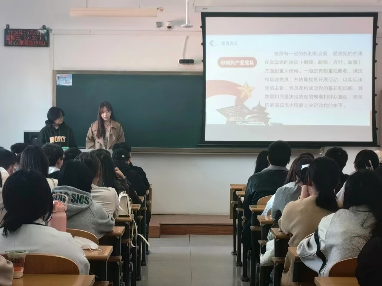 党建工作部负责人耿溪遥介绍了中国共产党党员的含义及职责使命,中国共产党是中国工人阶级的先锋队,同时是中国人民和中华民族的先锋队,是中国特色社会主义事业的领导核心。党建工作部负责人张春园介绍了入党申请书的书写要求以及党支部工作内容和发展情况,同时向大家分享了自己对党的认识。