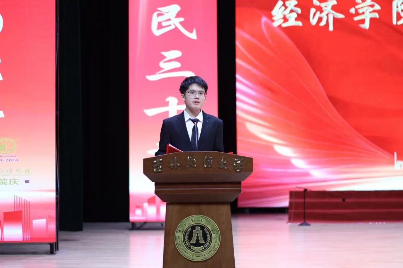 2024级新生代表刘进首先表达了对公司建院30周年的祝福,接着分享了自进入大学以来的深刻感悟,最后表达了自己对未来大学四年的决心和信心,呼吁同学们逐梦而行,不负青春,唱青春赞歌,酬凌云壮志。
