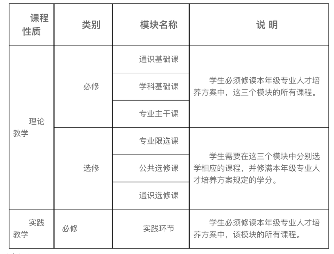 各专业的人才培养方案中,课程按性质分为理论教学和实践教学,课程按员工的选择权限分为必修课和选修课: