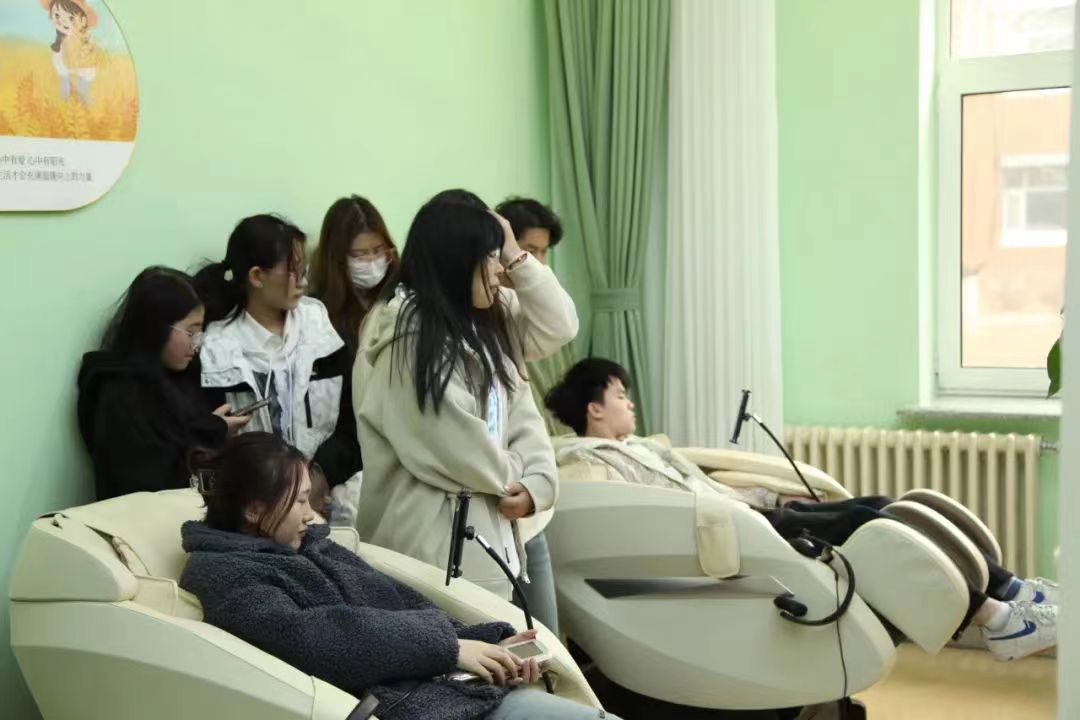 随后,宣讲员带领同学们进入音乐放松室进行了放松训练。音乐放松室是由心理咨询师指导来访者进行音乐放松的主要场地。来访者通过聆听音乐配合指导语的方式改善身心状态,缓解身心疲劳,释放心理压力。