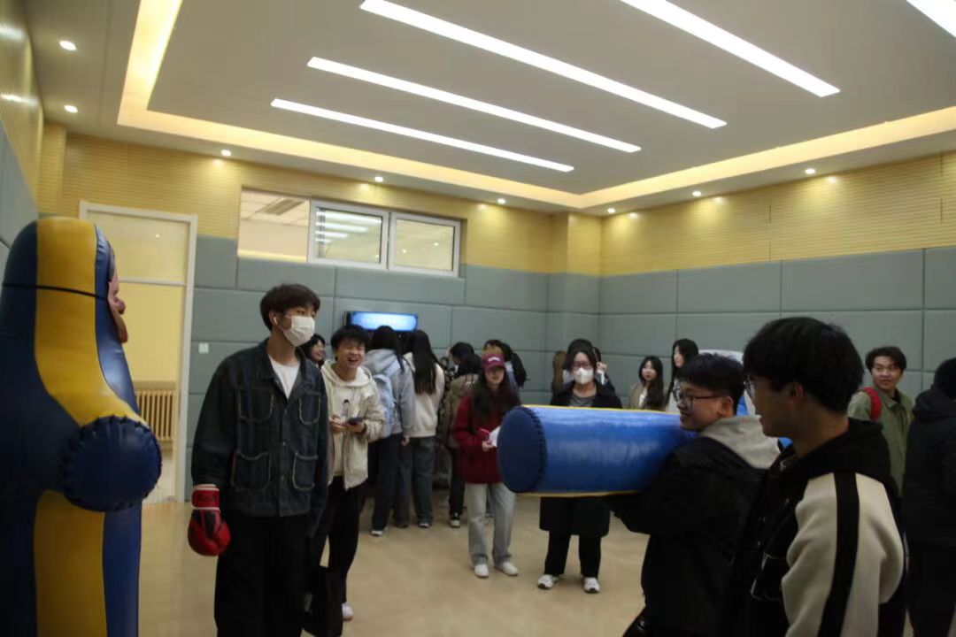 最后,同学们跟随着宣讲员的步伐来到了情绪宣泄室。情绪宣泄室是供来访者宣泄内心情绪的主要场地,包含体感互动宣泄仪、智能呐喊宣泄仪、智能音乐打击宣泄仪等各种解压道具。在情绪宣泄室中来访者可以通过击打、呐喊等方式,将负面情绪通过一个安全合适的途径宣泄出来。