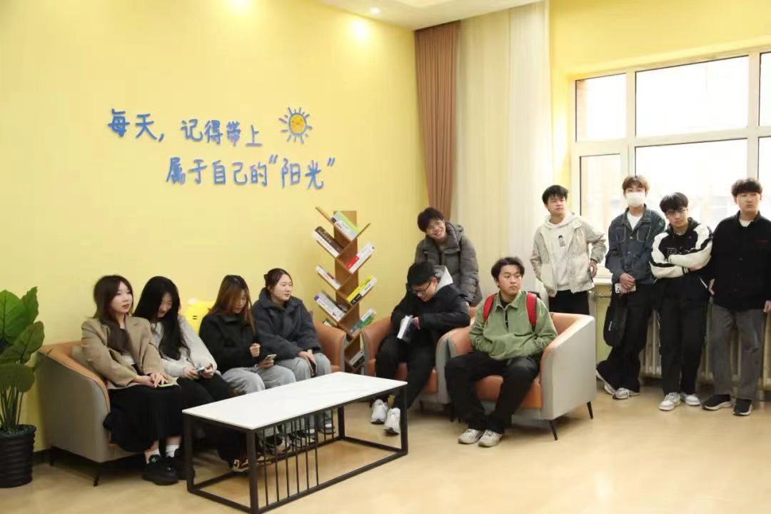 然后,宣讲员带领同学们进入了咨询预约等候室,咨询预约等候室是来访者进行预约、等候咨询的主要场地。来访者可通过网络、电话或者直接到预约等候室进行心理咨询预约,在进行正式咨询前可在此等候。