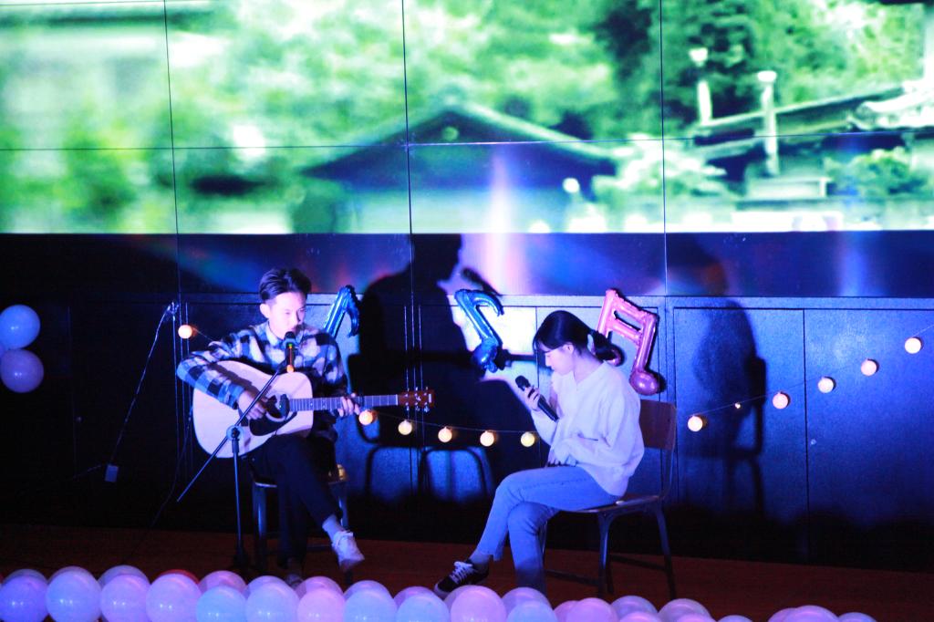 由2019级卡拉冠军赵诺和刘畅学姐协卡拉全体选手演唱《一路生花》。