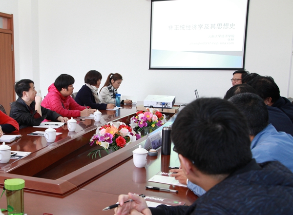 张林教授的学术报告以《非正统经济学及其思想史》为题。在报告过程中,张教授主要讲述了三大部分内容,分别为:什么是非正统经济学、非正统经济学的构成与发展以及非正统经济学思想史研究。张林教授认为非正统经济学与正统经济学属于意识形态上的概念,非正统经济学的目的在于解决社会供应过程,是一门历史科学。同时,张林教授着重阐述了非正统经济学的三个主体流派:以凡勃伦为代表的制度主义、以凯恩斯、斯拉法为代表的后凯恩斯主义和以马克思为代表的激进经济学。在张教授报告的尾声,他还对非正统经济学思想史进行了粗略的介绍,并为参会人员提供了进一步了解非正统经济学的读物,如《A History of Heterodox Economics》等等。